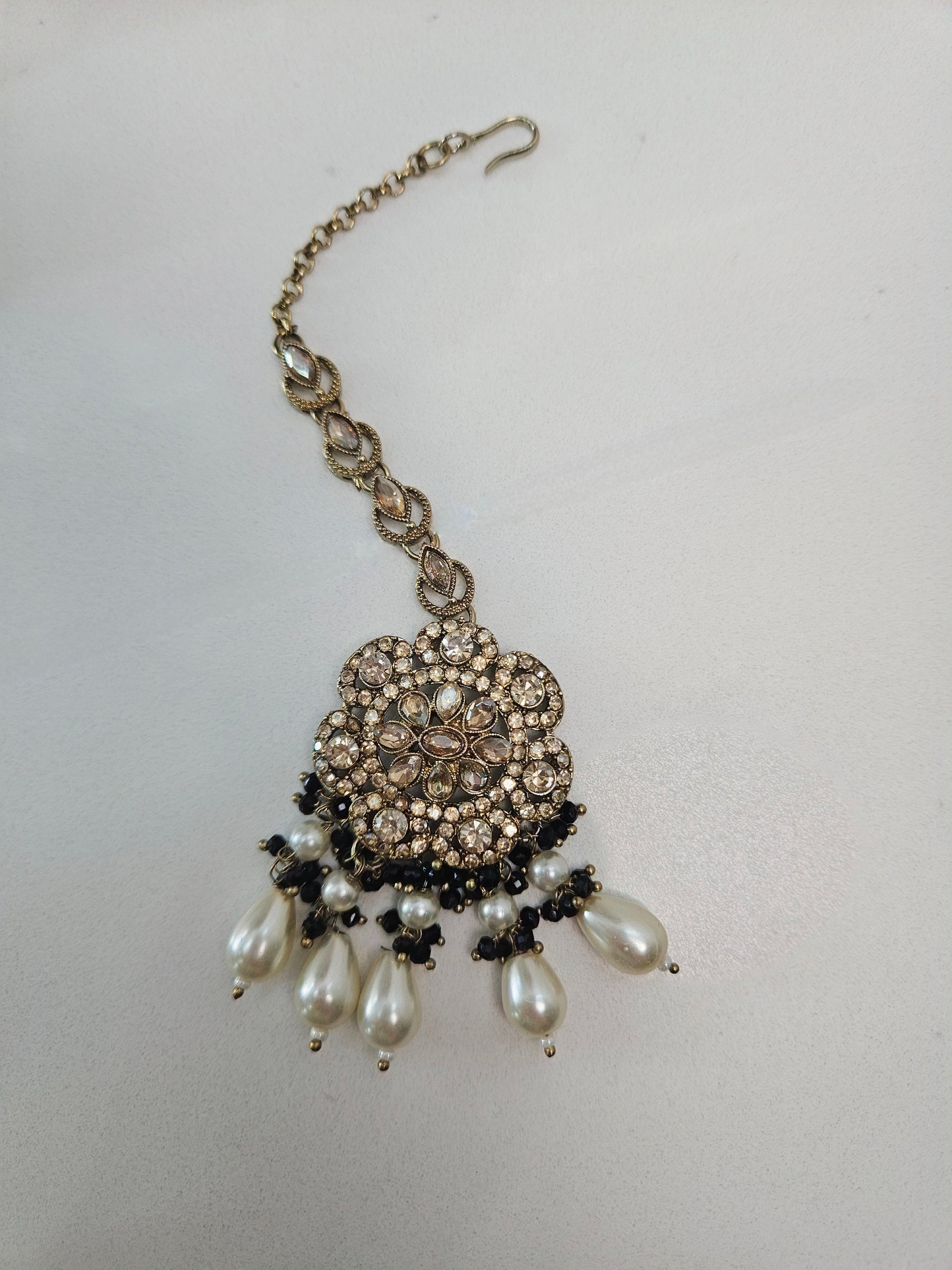 This exquisite choker necklace showcases traditional Kundan Polki craftsmanship with an antique gold finish that evokes timeless elegance. Hand-set polished gemstones are complemented by lustrous black and white faux pearls, creating striking contrast and depth.