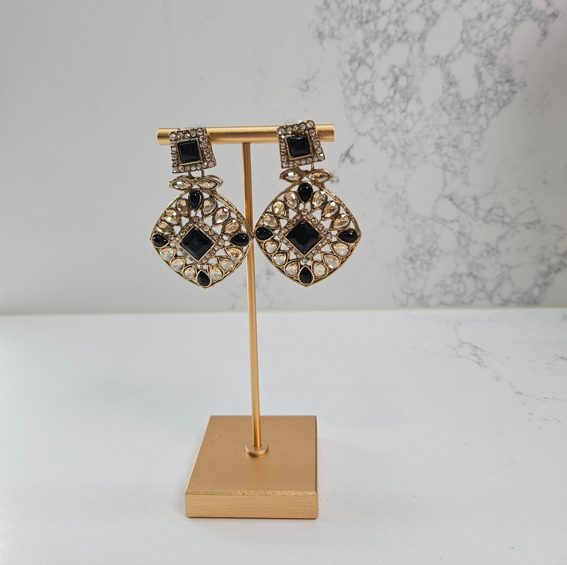 Elevate your festive look with this stunning choker set, featuring dark gold and black crystals that catch the light beautifully. This complete three-piece ensemble includes a statement choker, matching earrings, and an ornate tikka, designed to work together for a cohesive, luxurious appearance.