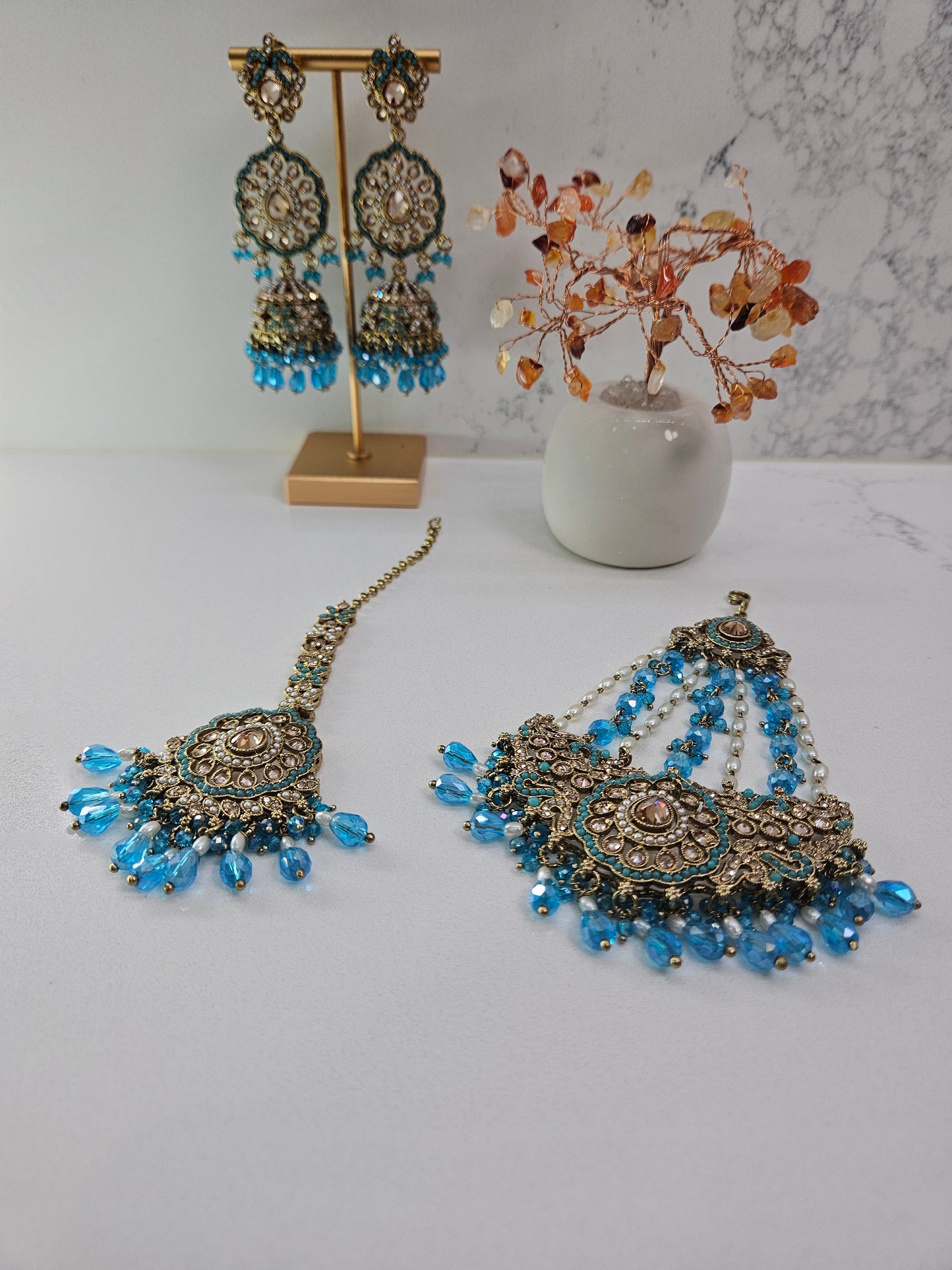 Elevate your bridal look with this stunning 3-piece blue crystal jewelry set, featuring a traditional kundan maang tikka, passa, and matching jhumka earrings. Crafted in antique gold finish, each piece showcases intricate detailing and radiant blue crystals that capture light beautifully.