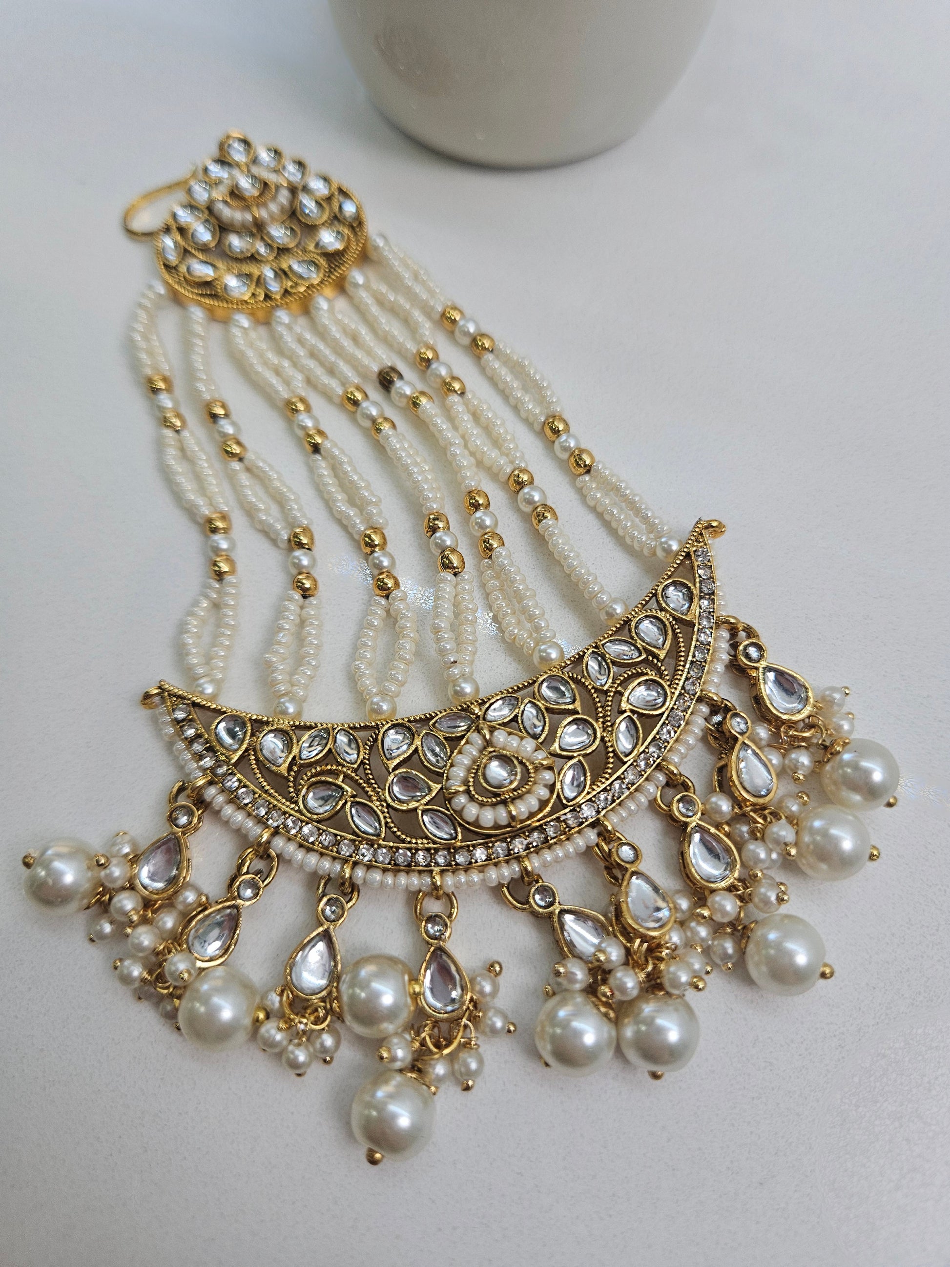 Elevate your bridal ensemble with this stunning multi-strand pearl passa, a timeless Pakistani and Indian wedding essential. Adorned with intricate kundan chandbali work and shimmering gold accents, this side headpiece radiates sophistication and grace.