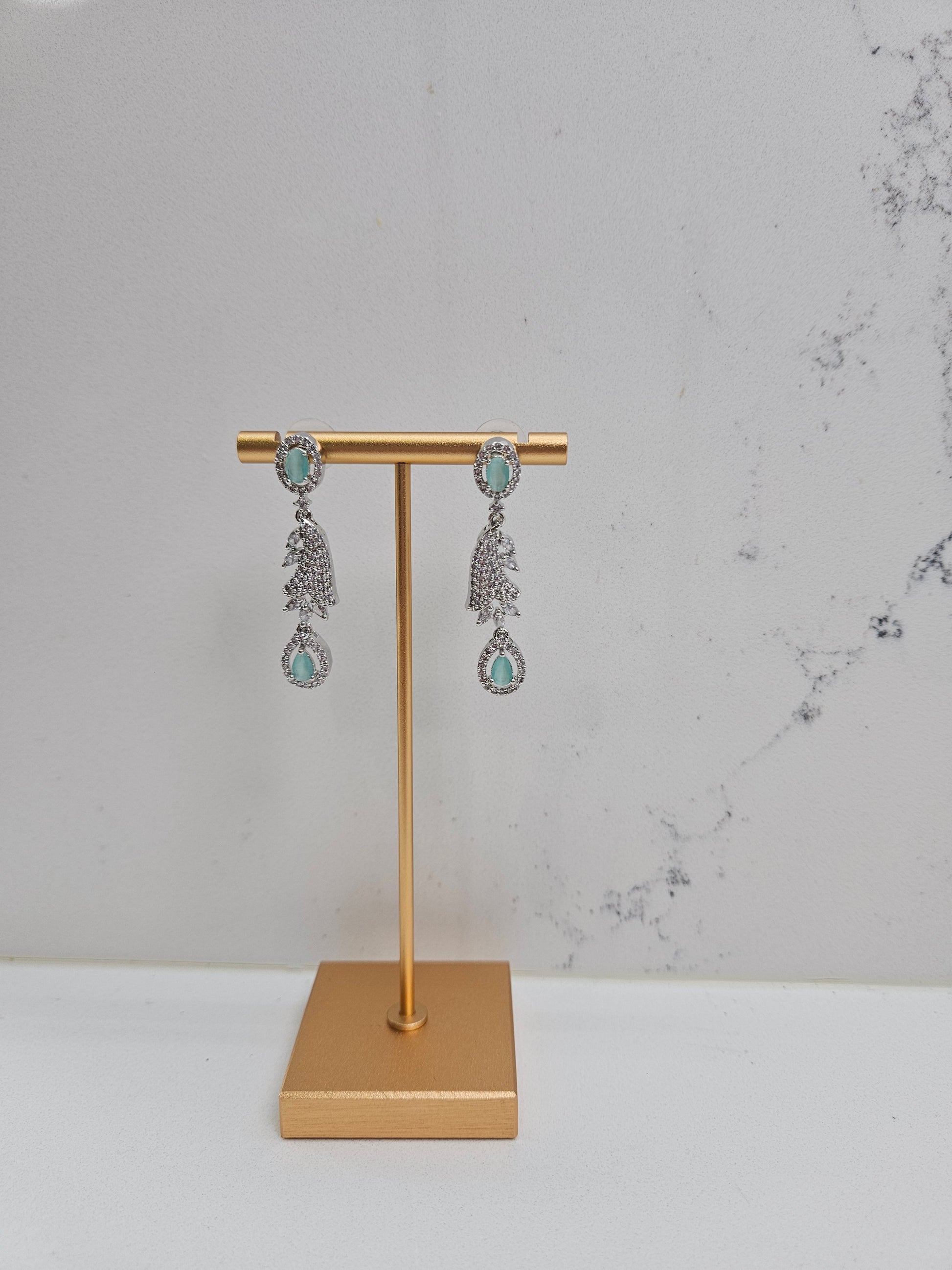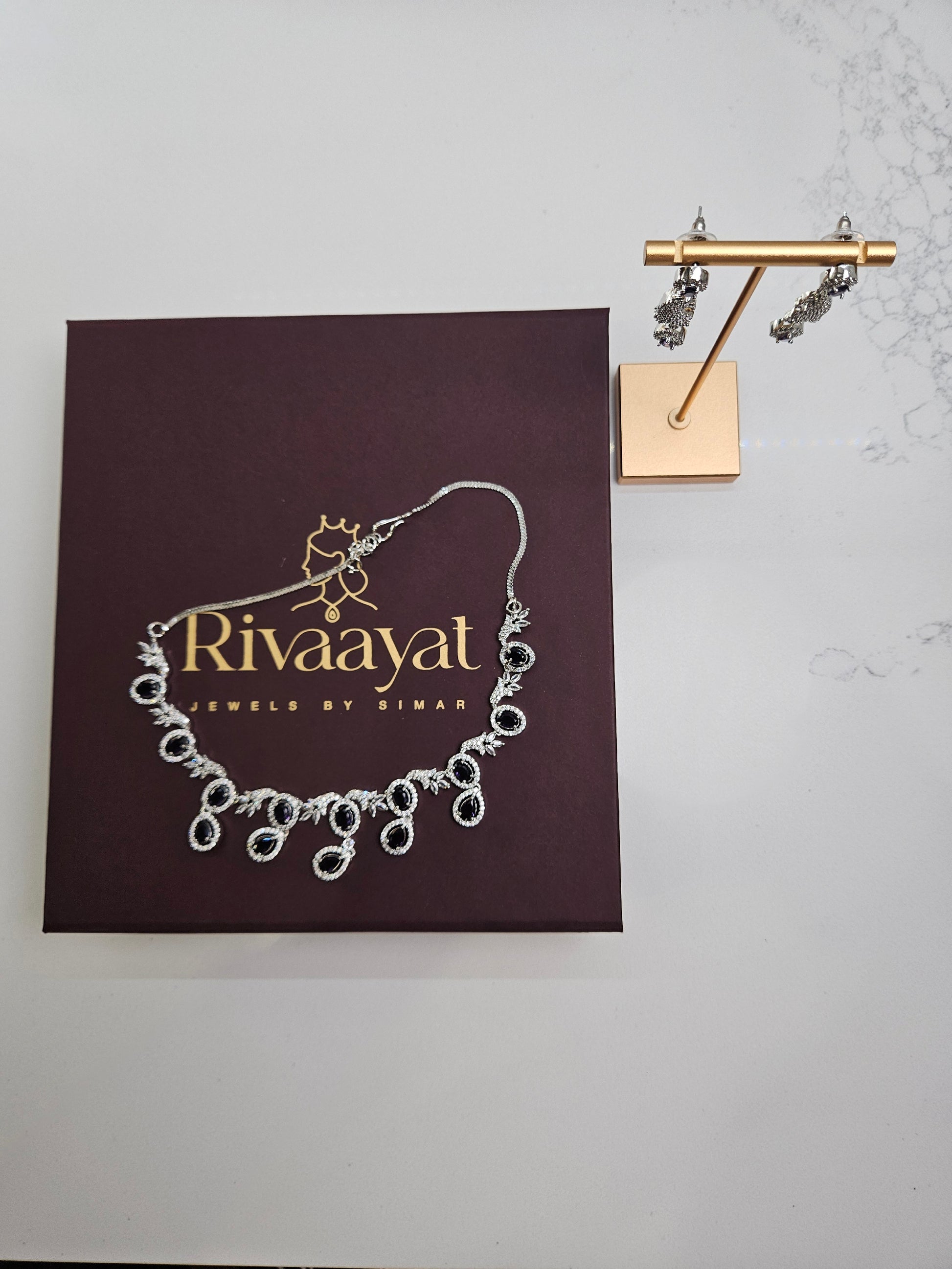 This AD Necklace Set combines a striking pendant necklace with coordinating earrings, offering a complete jewellery solution. The emerald-toned stones are complemented by brilliant AD (American Diamond) settings that enhance light reflection and visual impact.