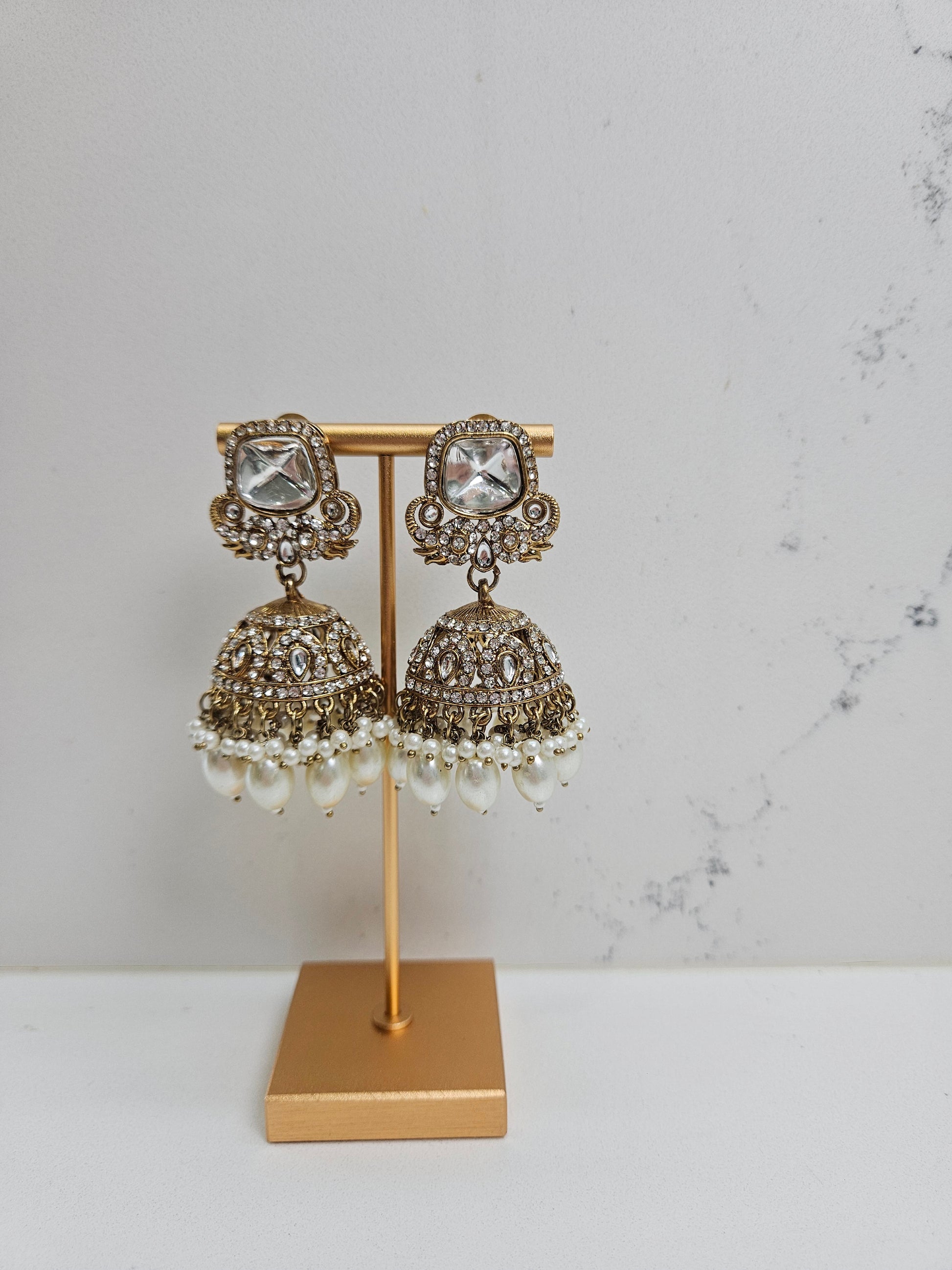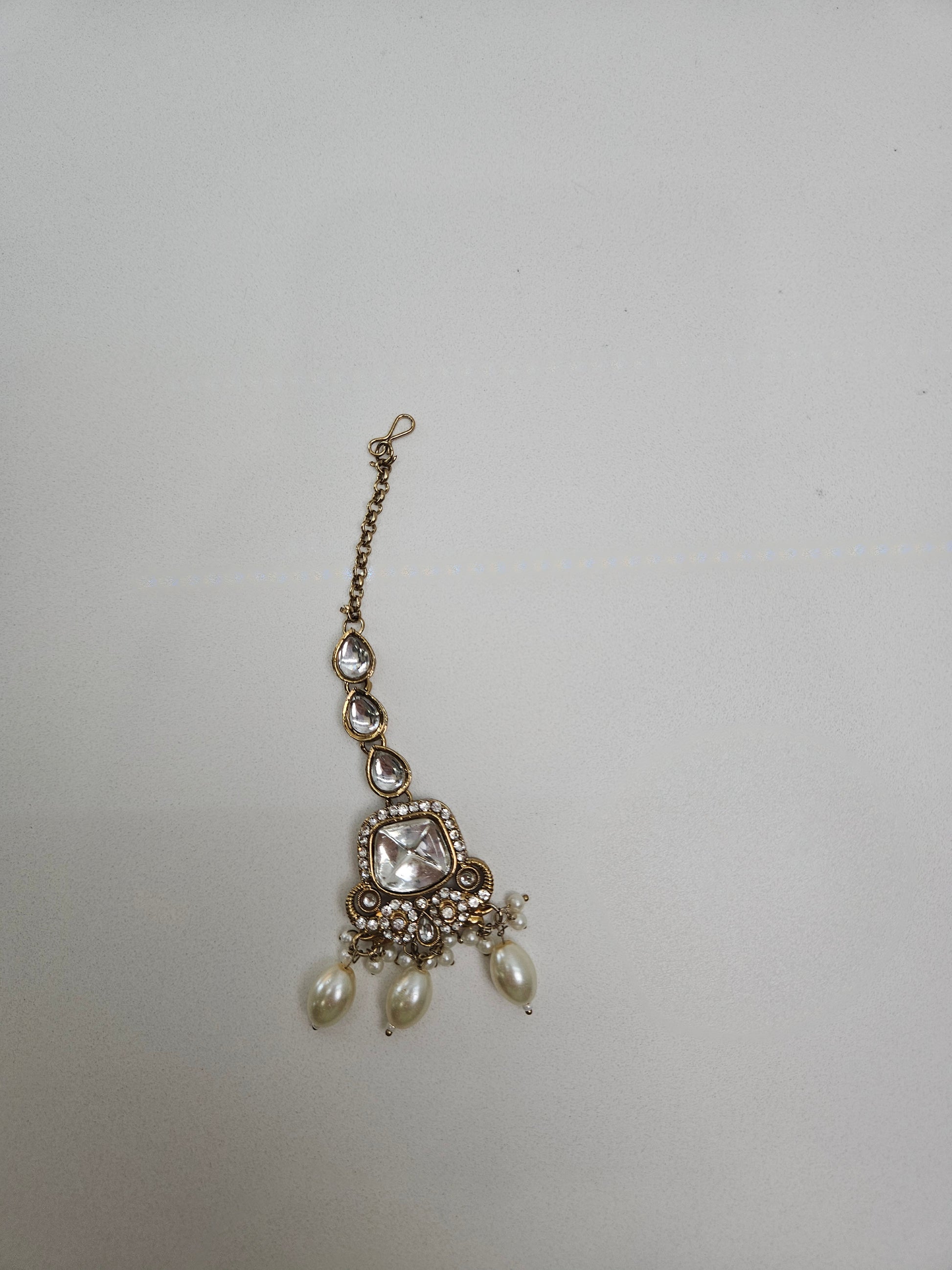 This exquisite three-piece ensemble showcases traditional kundan craftsmanship paired with lustrous pearls. The choker features intricate gold detailing with pearl accents, complemented by matching earrings and a decorative mang tikka.