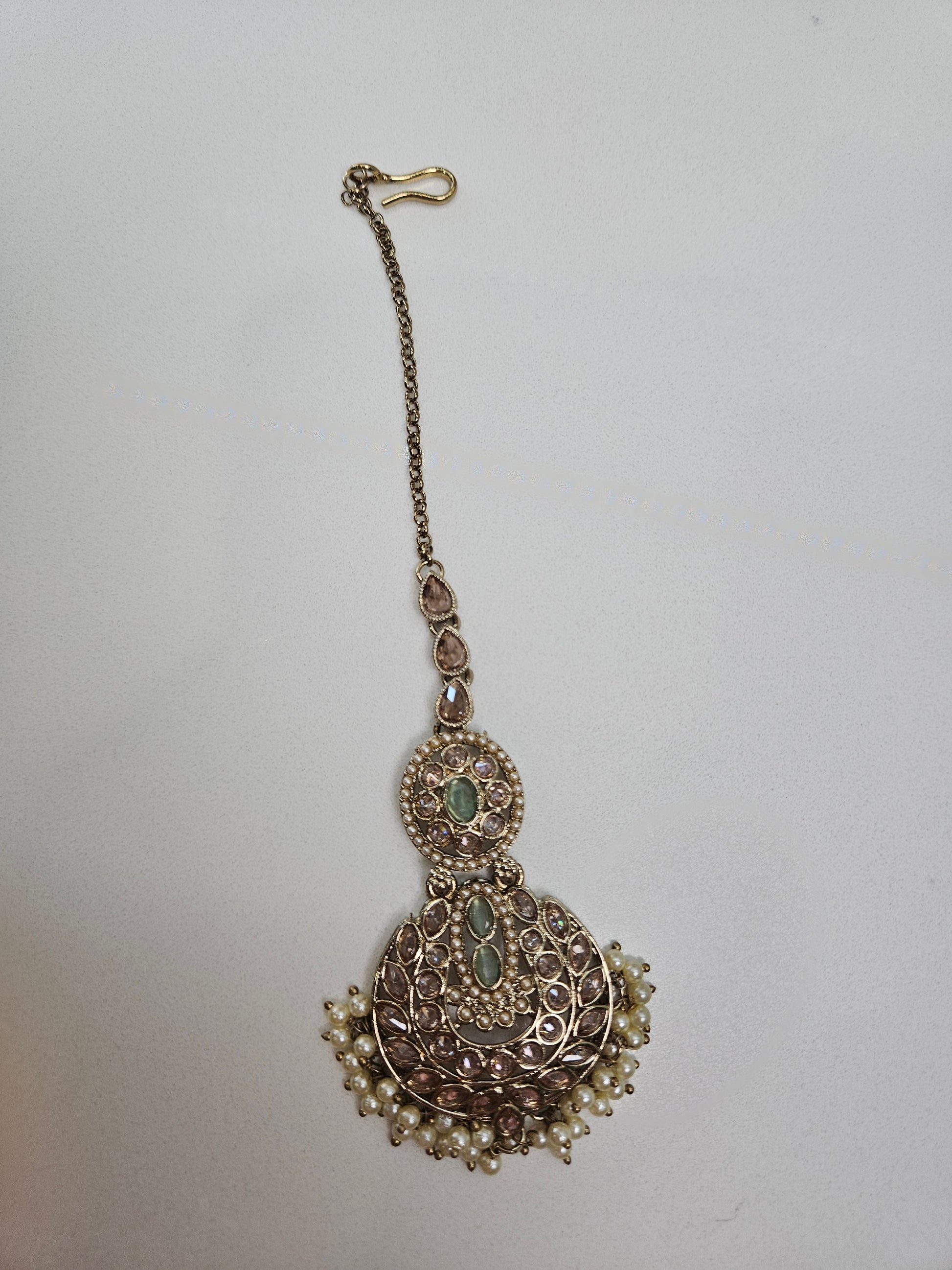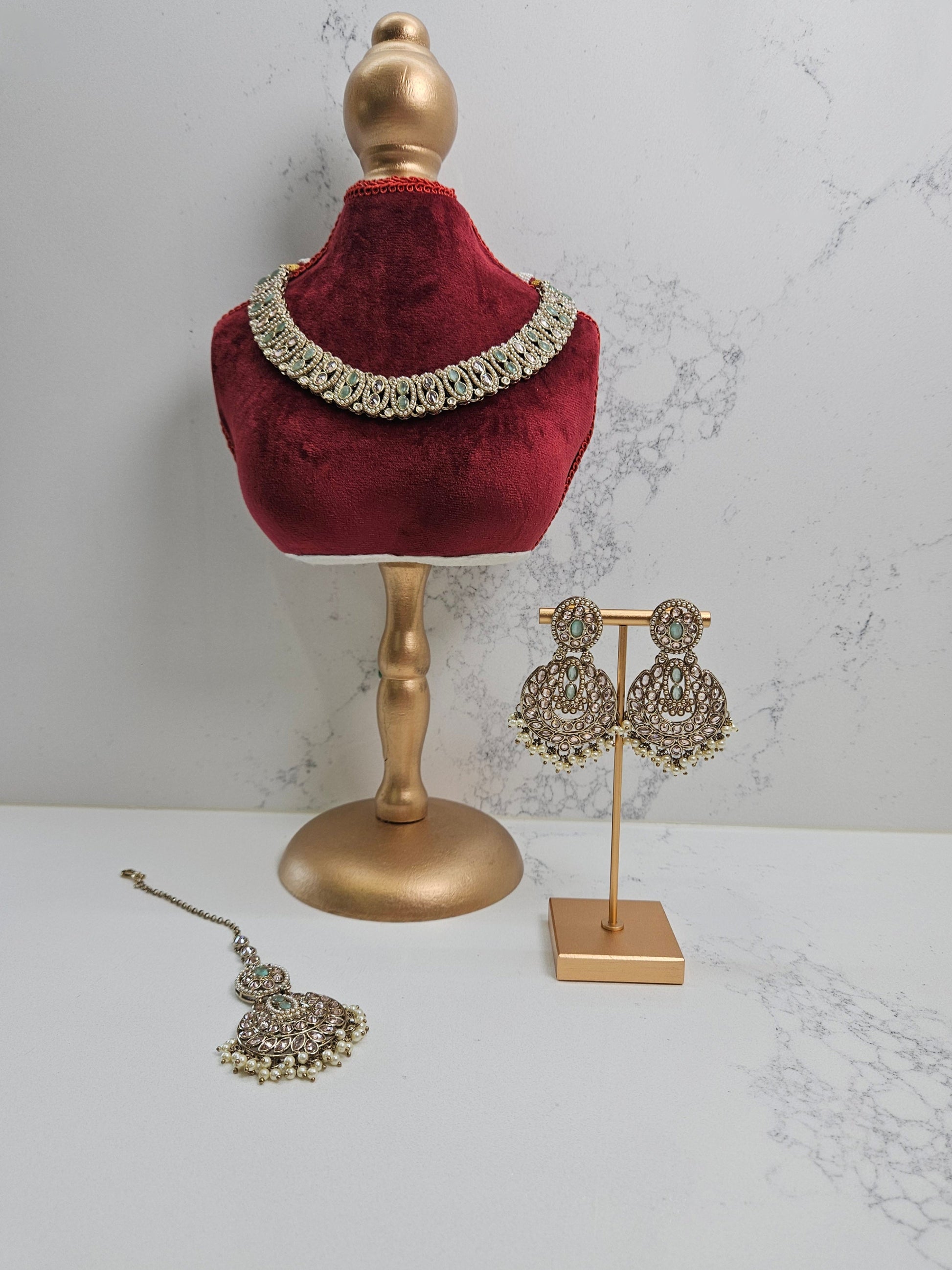 Elevate your jewellery collection with this stunning three-piece bridal set that captures timeless elegance. The choker necklace showcases meticulously placed kundan stones and colourful gemstones in lustrous gold plating, commanding attention with every movement.