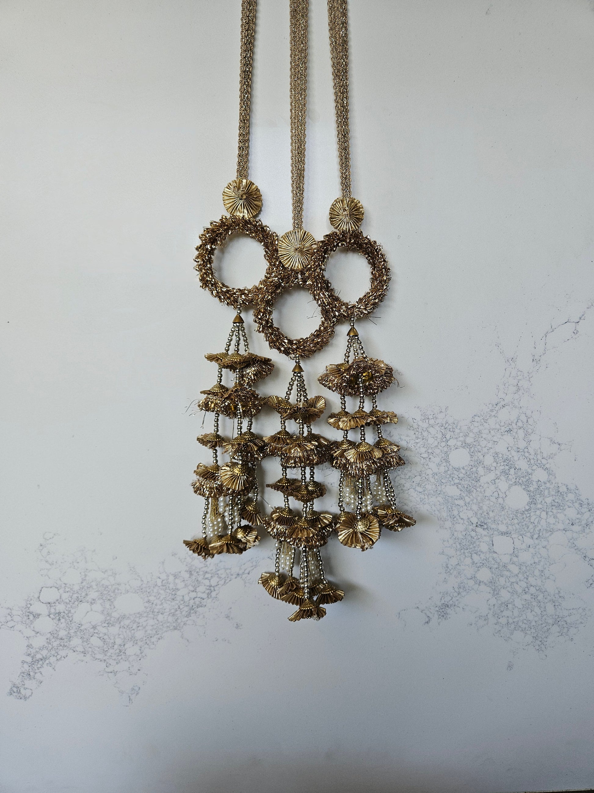 Get ready to turn heads and celebrate your heritage in style with this stunning Punjabi Paranda! Adorned with shimmering golden decorative tassels.
