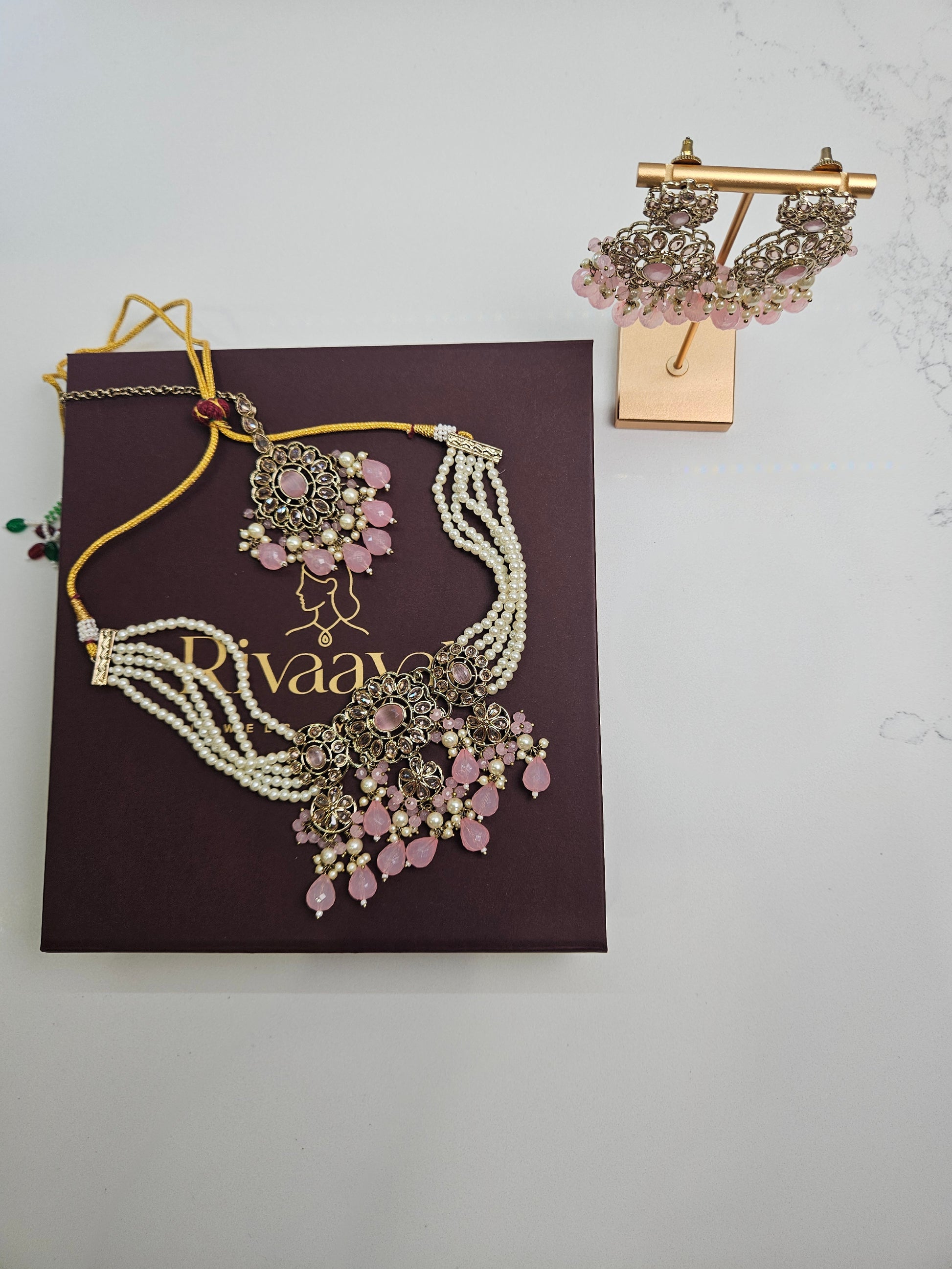 Pastel Pink Kundan Choker Set Get ready to turn heads with this absolutely gorgeous pastel pink kundan choker set. This charming three-piece collection brings together a delicate choker, graceful long earrings, and a beautiful tikka.