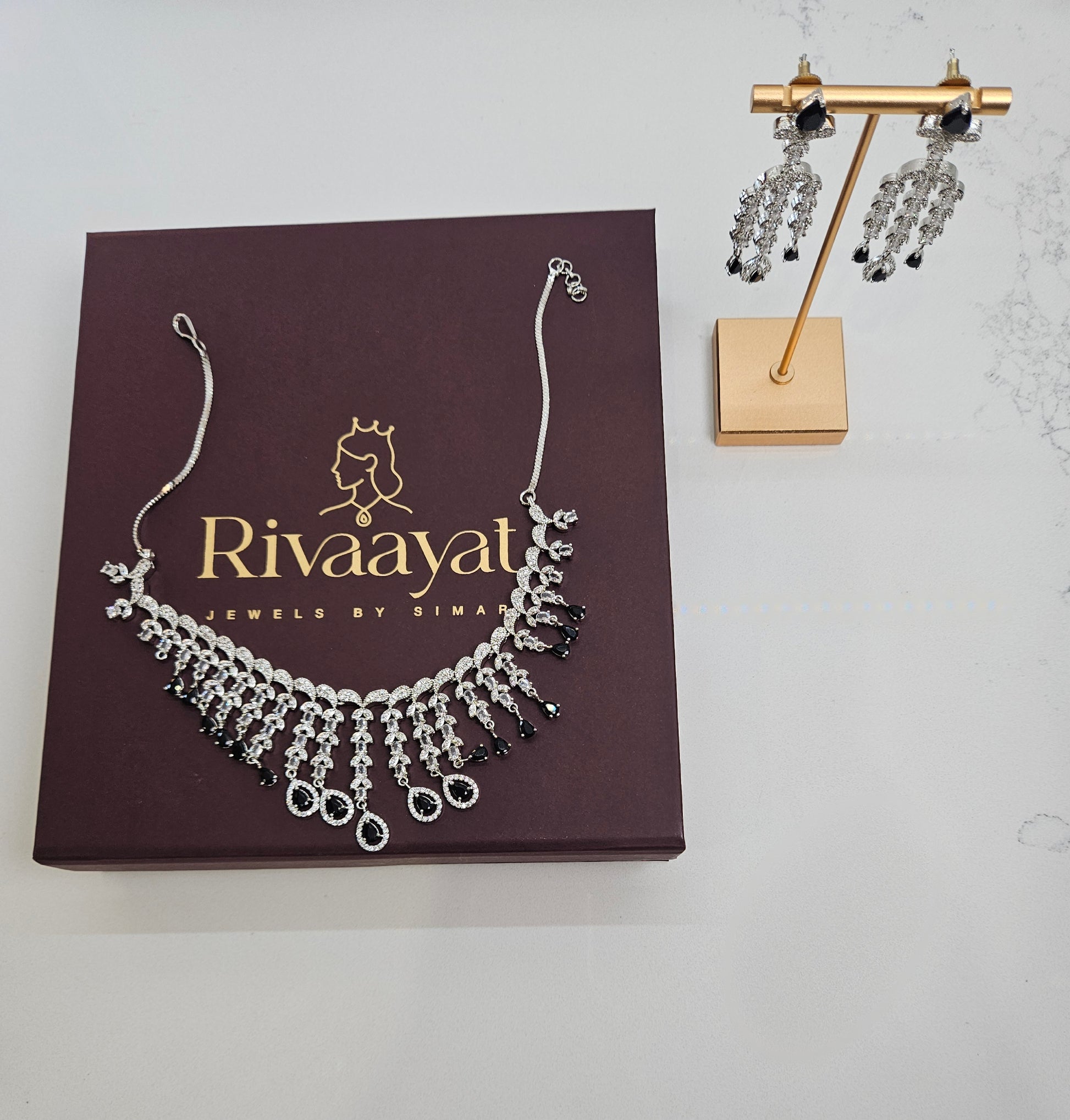 Elevate your jewellery collection with this sophisticated AD necklace set, crafted to deliver timeless elegance. The set features lustrous black and clear stones in a refined design that transitions seamlessly from day to evening wear. Choose between two distinctive variants: the classic black stone option for understated luxury, or the navy blue stone version for a deeper, more dramatic aesthetic.