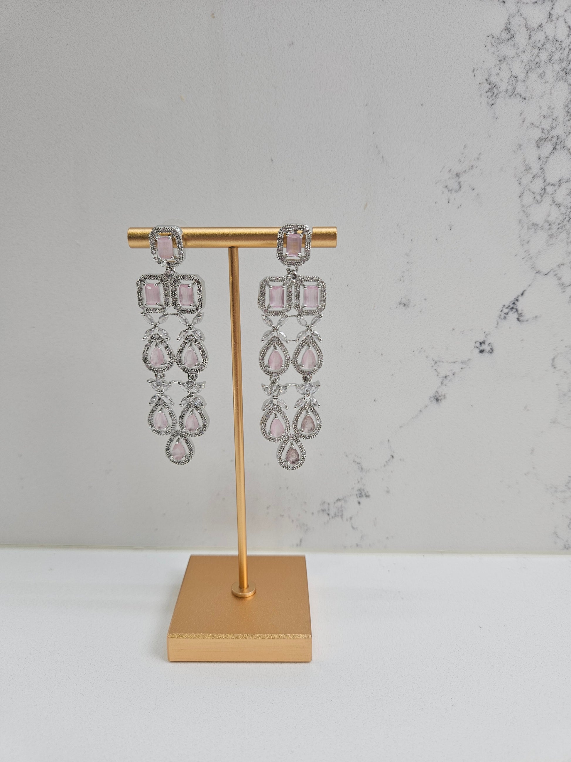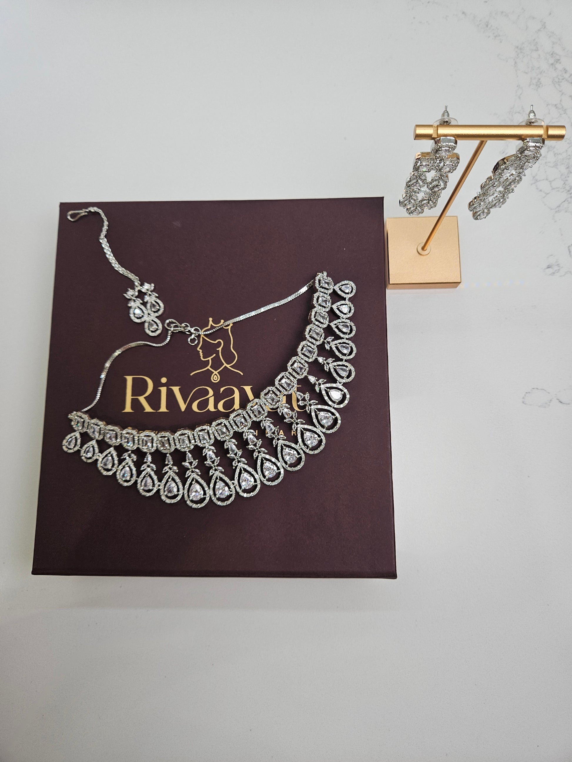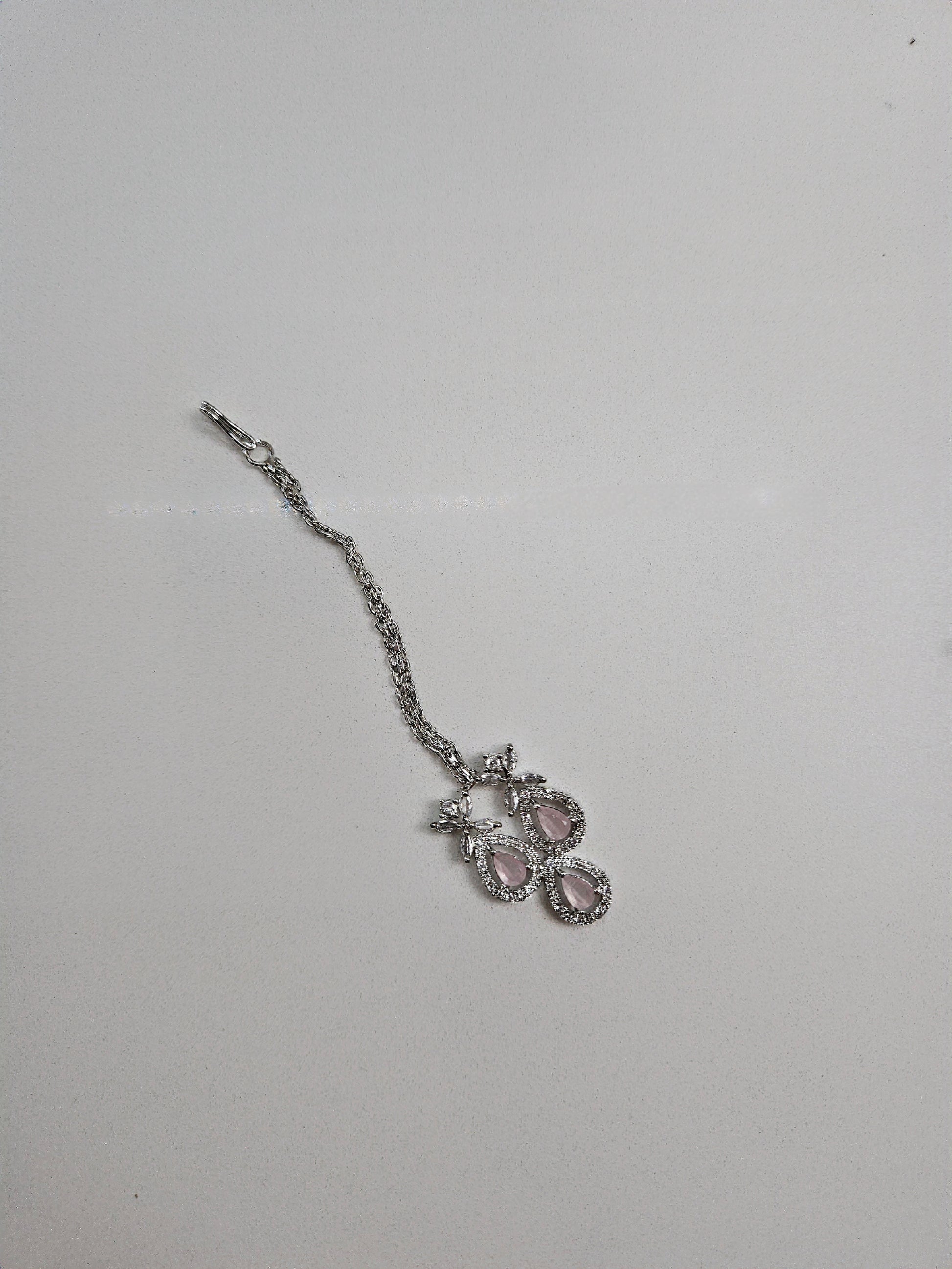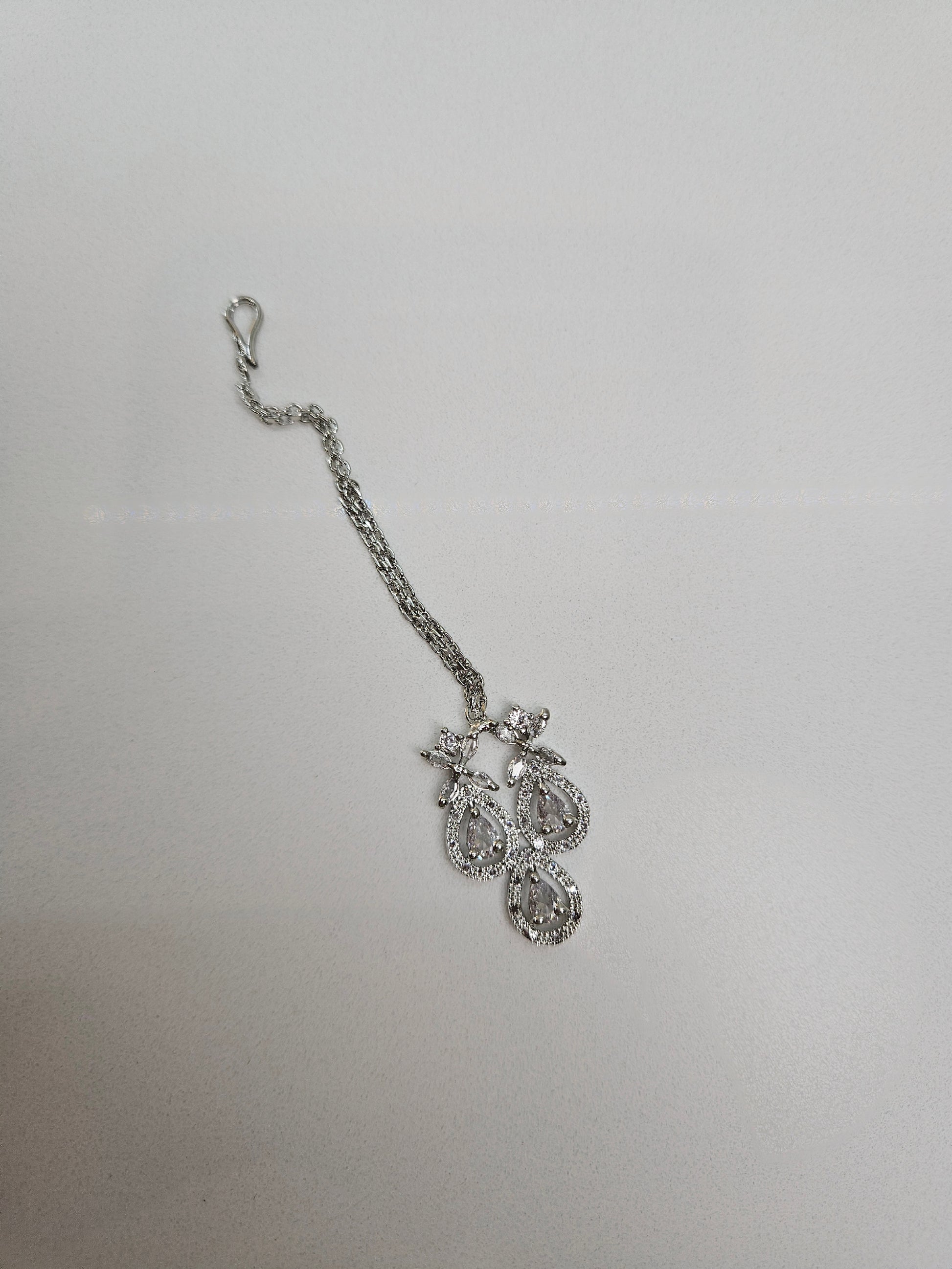 Elevate your festive ensemble with this exquisite American diamond jewellery set, meticulously crafted to complement traditional and contemporary styles alike. The collection features radiant stud earrings paired with an ornate maang tikka, each piece showcasing brilliant diamond-like sparkle and refined detailing.